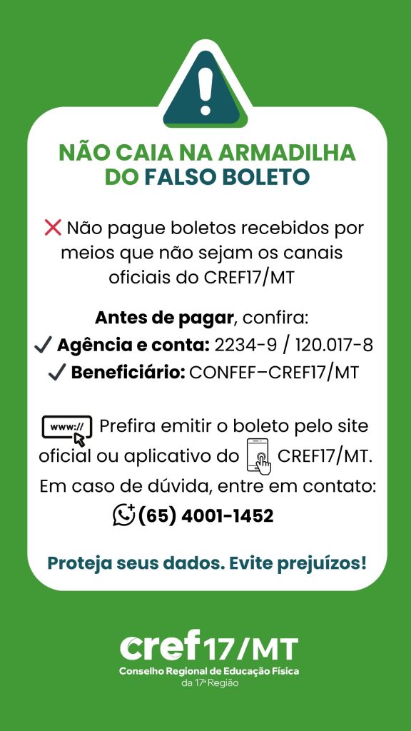 Atenção, profissionais de Educação Física de Mato Grosso! O CREF17/MT faz um alerta importante sobre o golpe do falso boleto,…