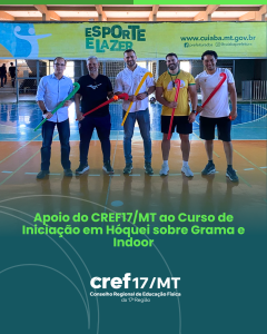 O Conselho Regional de Educação Física da 17ª Região – CREF17/MT registra seu reconhecimento e agradecimento ao secretário de Cultura, Esporte e Lazer de Cuiabá, Jefferson Neves, ao 2º vice-presidente do CREF17, Dinho Ribeiro, e ao conselheiro Elvis Magalhães, pela dedicação na organização do 1° Curso de Iniciação Esportiva em Hóquei sobre Grama e Indoor.