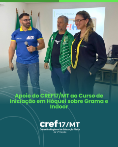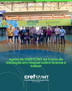 O Conselho Regional de Educação Física da 17ª Região – CREF17/MT registra seu reconhecimento e agradecimento ao secretário de Cultura, Esporte e Lazer de Cuiabá, Jefferson Neves, ao 2º vice-presidente do CREF17, Dinho Ribeiro, e ao conselheiro Elvis Magalhães, pela dedicação na organização do 1° Curso de Iniciação Esportiva em Hóquei sobre Grama e Indoor.