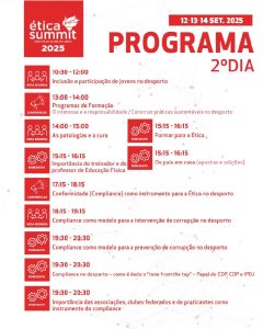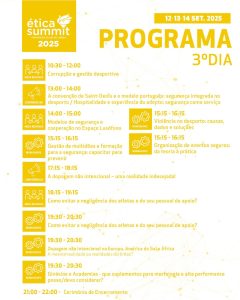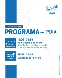 📅 De 12 a 14 de setembro acontece o Ética Summit 2025 – um encontro online, gratuito e totalmente em português que vai reunir especialistas de Portugal, Brasil e África para falar sobre ética, integridade e fair play no esporte.
