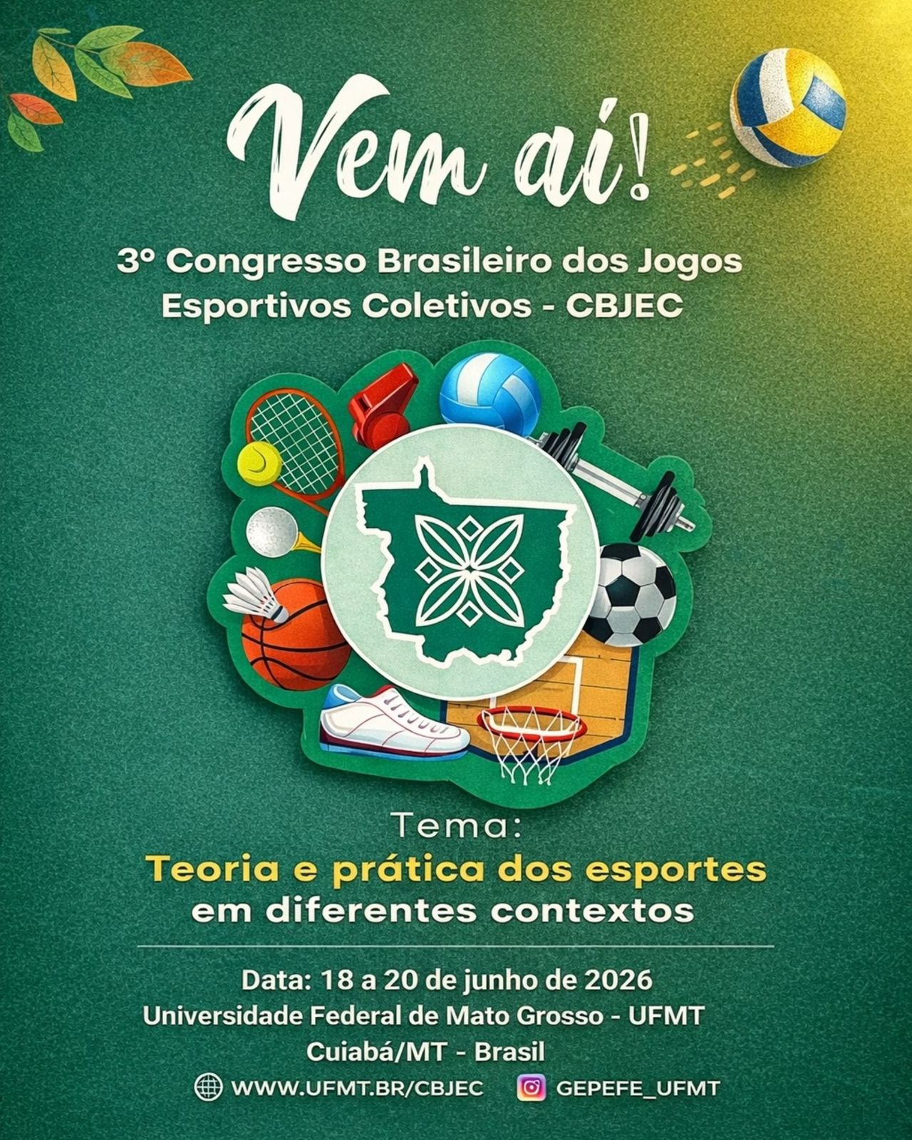 O Conselho Regional de Educação Física da 17ª Região – Mato Grosso (CREF17/MT) é apoiador, pelo segundo ano consecutivo, do Congresso Brasileiro dos Jogos Esportivos Coletivos (CBJEC), um dos maiores e mais relevantes eventos acadêmico-científicos da área de Educação Física no país. A terceira edição do congresso será realizada de forma presencial entre os dias 18 e 20 de junho de 2026, na Universidade Federal de Mato Grosso (UFMT), em Cuiabá/MT.