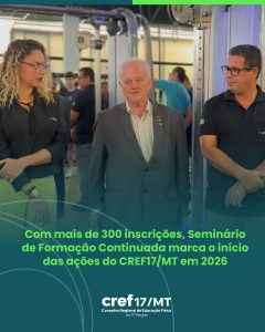 O Conselho Regional de Educação Física da 17ª Região (CREF17/MT) realizou, em Primavera do Leste, o Seminário de Formação Continuada de Educação Física, marcando o início das ações da atual gestão em 2026. O evento contou com 347 inscrições, distribuídas em três cursos de qualificação ao longo de quatro dias de programação, com ampla participação de profissionais e acadêmicos da área.