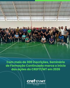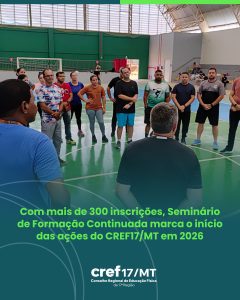O Conselho Regional de Educação Física da 17ª Região (CREF17/MT) realizou, em Primavera do Leste, o Seminário de Formação Continuada de Educação Física, marcando o início das ações da atual gestão em 2026. O evento contou com 347 inscrições, distribuídas em três cursos de qualificação ao longo de quatro dias de programação, com ampla participação de profissionais e acadêmicos da área.