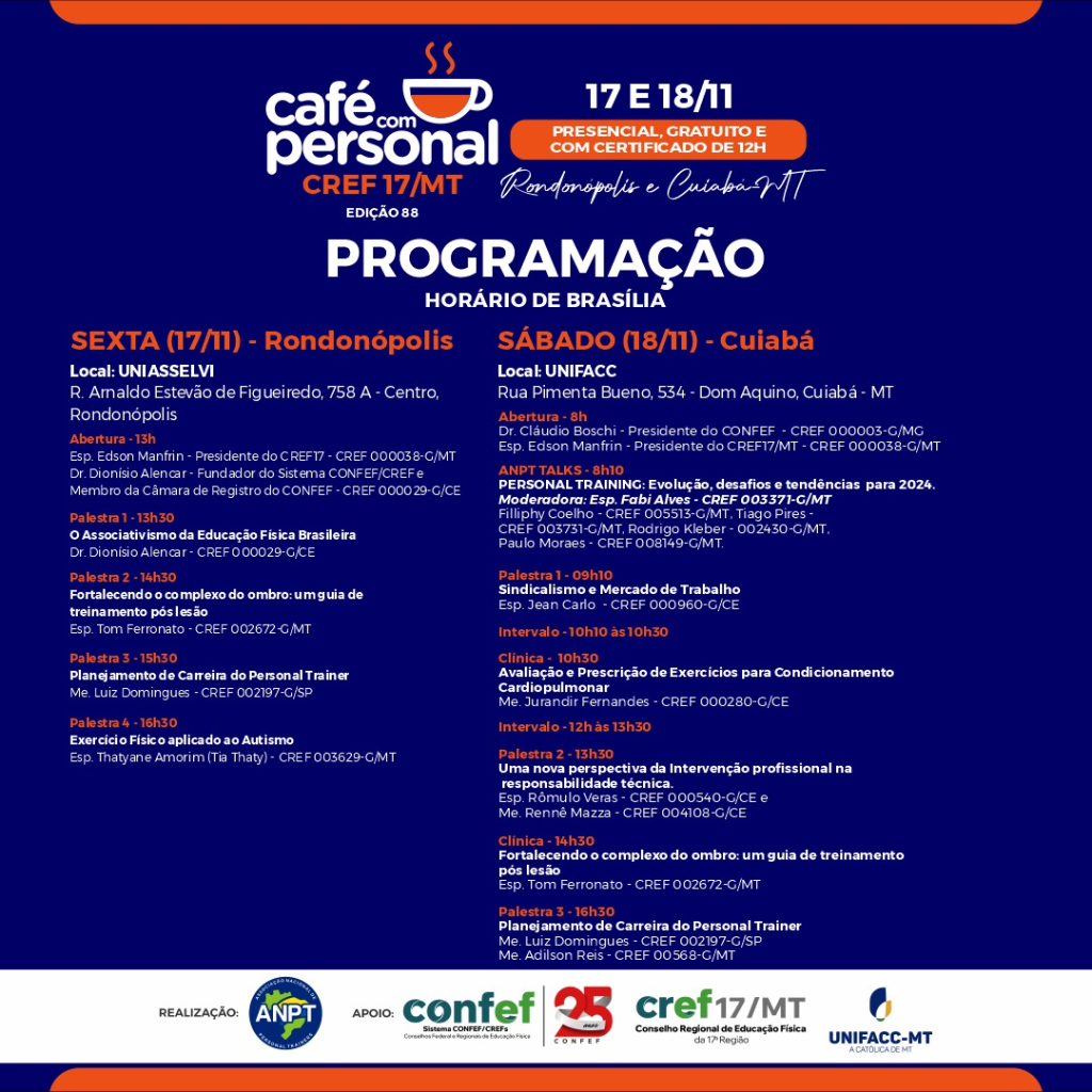 O Café com Personal, Edição 88, está chegando nos dias 17 e 18 de novembro, em Rondonópolis e Cuiabá! 🗓️
